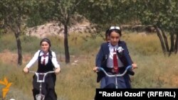 Школьницы из нескольких селений Вахшского района ездят в школу на велосипедах. Девушки из селений Гулбог, Шахдрез, Файзбахш Вахшского района каждое утро проезжают на своих велосипедах 5-7 километров, чтобы вовремя попасть на уроки в школе, которая находится в соседнем селе Дехконобод.