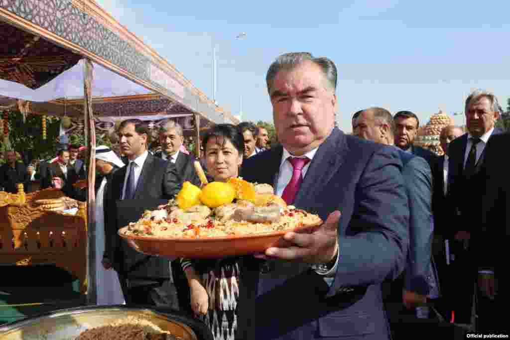 Президент Таджикистана Эмомали Рахмон 25 октября ознакомился с выставкой народных ремёсел во Дворце Арбоб на окраине Худжанда и принял участие в торжествах Фестиваля «Оши палав», «Иди асалу харбуза» и «Ширинихои милли».Дар ин ҷашнвора президенти Тоҷикистон Эмомалӣ Раҳмон ҳам иштирок кард.